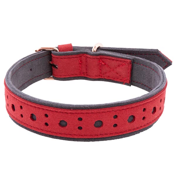Collar made of grey soft micro suede, with elegant red English decorative motif and accessories in rose gold finish.